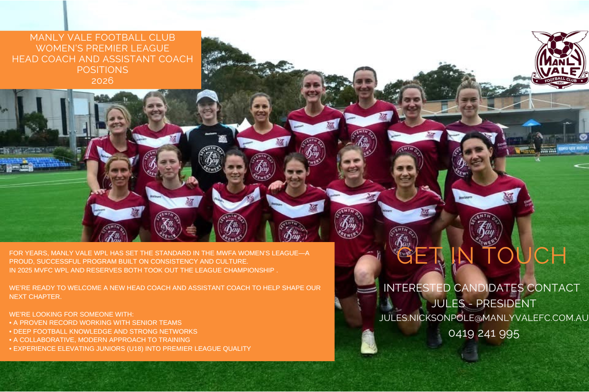 Manly Vale FC are recruiting for a Head Coach and Assistant Coach for their Women’s Premier League team in the 2026 season. If you are interested, please contact the President Jules – jules.nicksonpole@manlyvalefc.com.au, 0419 241 995
