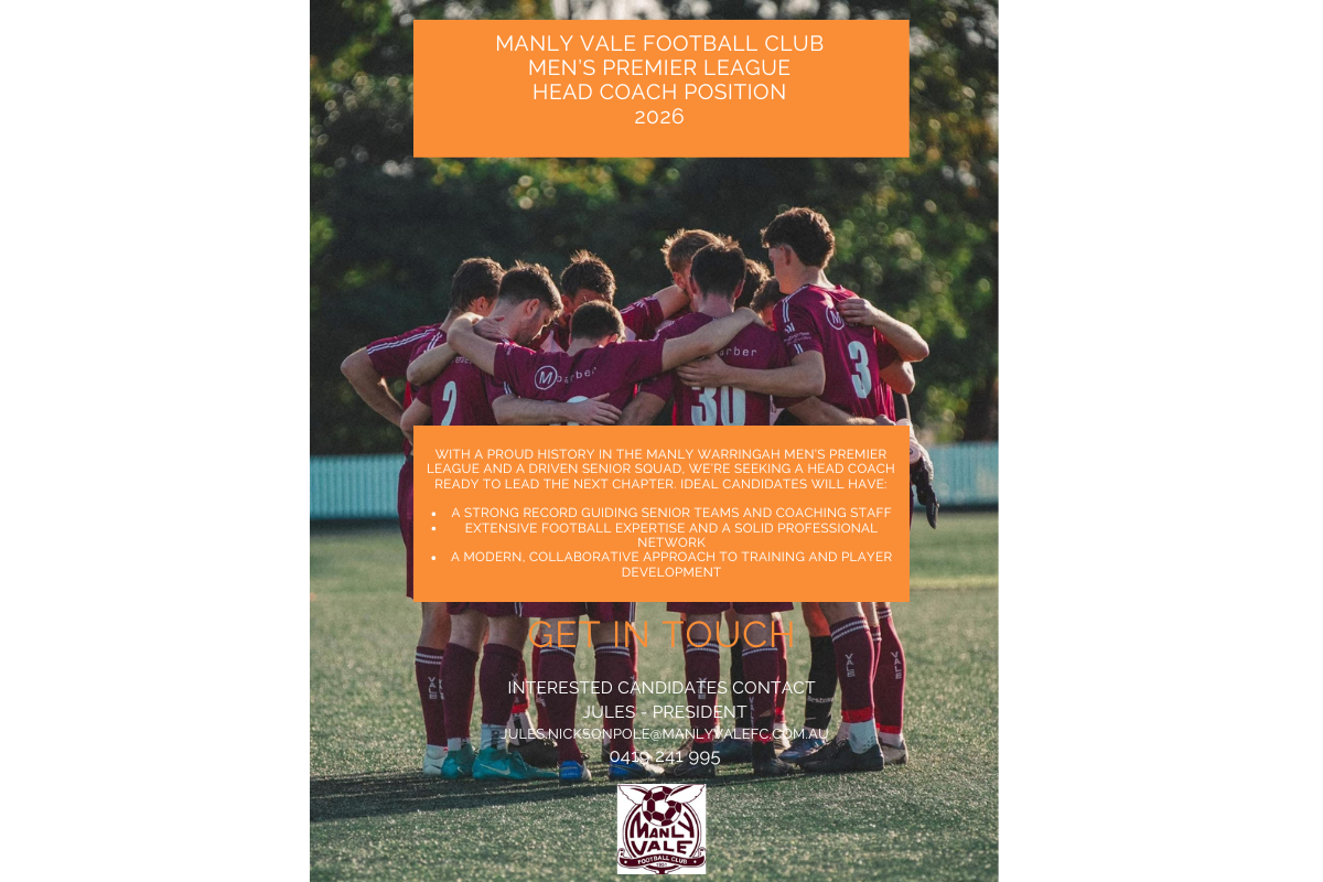 Manly Vale FC are recruiting for a Head Coach for their Men’s Premier League in the 2026 season. If you are interested, please contact the President Jules – jules.nicksonpole@manlyvalefc.com.au, 0419 241 995
